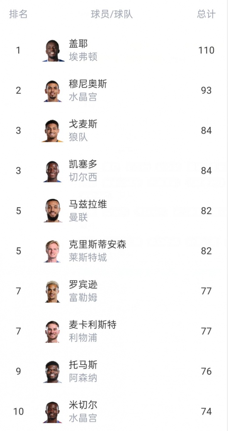 110次!埃弗頓中場蓋耶是本賽季英超唯一搶斷次數(shù)超100的球員