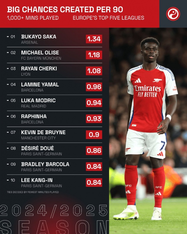 五大聯(lián)賽每90分鐘創(chuàng)造重大機(jī)會(huì)榜:薩卡1.34次居首,奧利塞次席