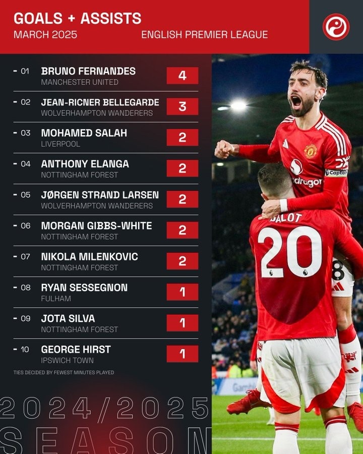英超第一!B費參與了曼聯(lián)在三月份英超比賽中的所有進球