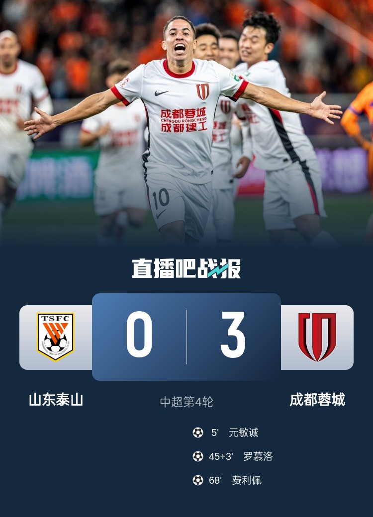 中超第4輪,成都蓉城客場3-0完勝山東泰山,終結了對對手的三連敗。