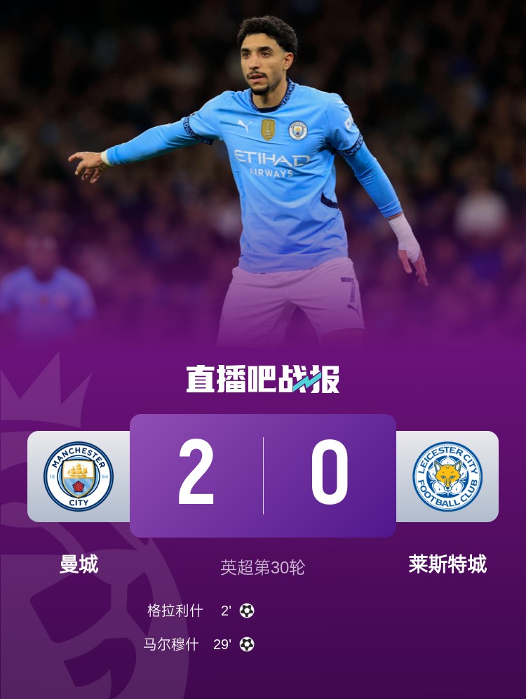 格拉利什閃擊破門,馬爾穆什擴(kuò)大領(lǐng)先優(yōu)勢(shì),曼城2-0擊敗萊斯特城。