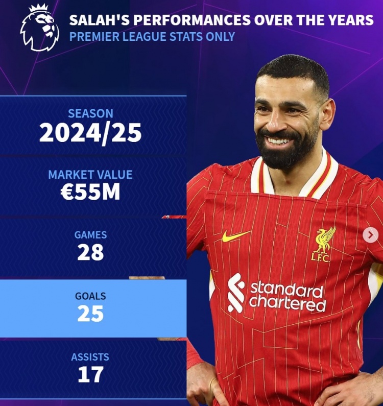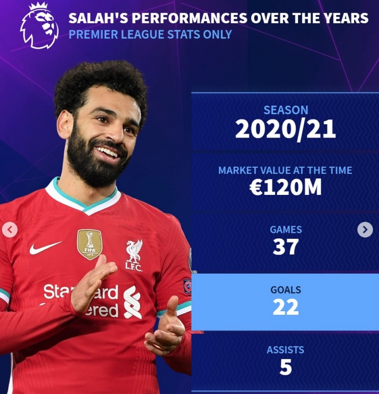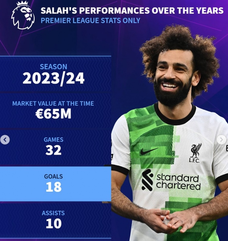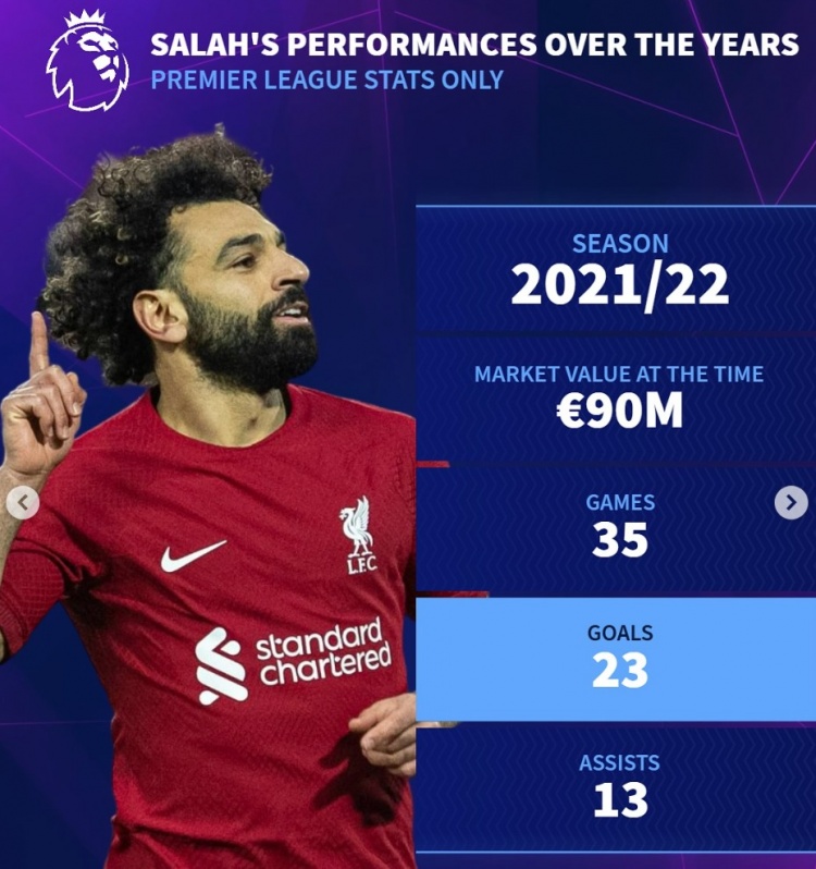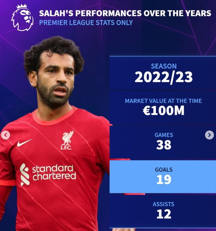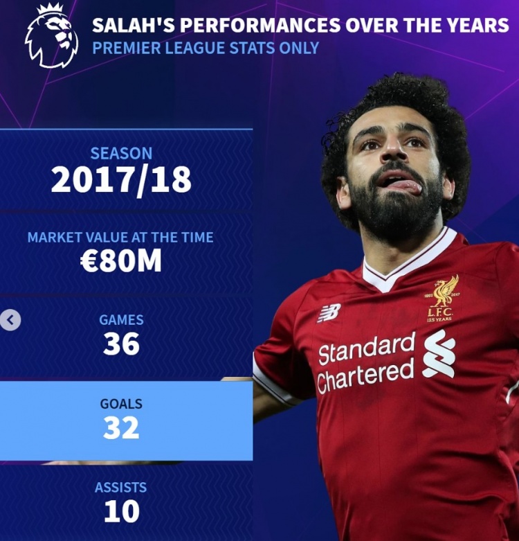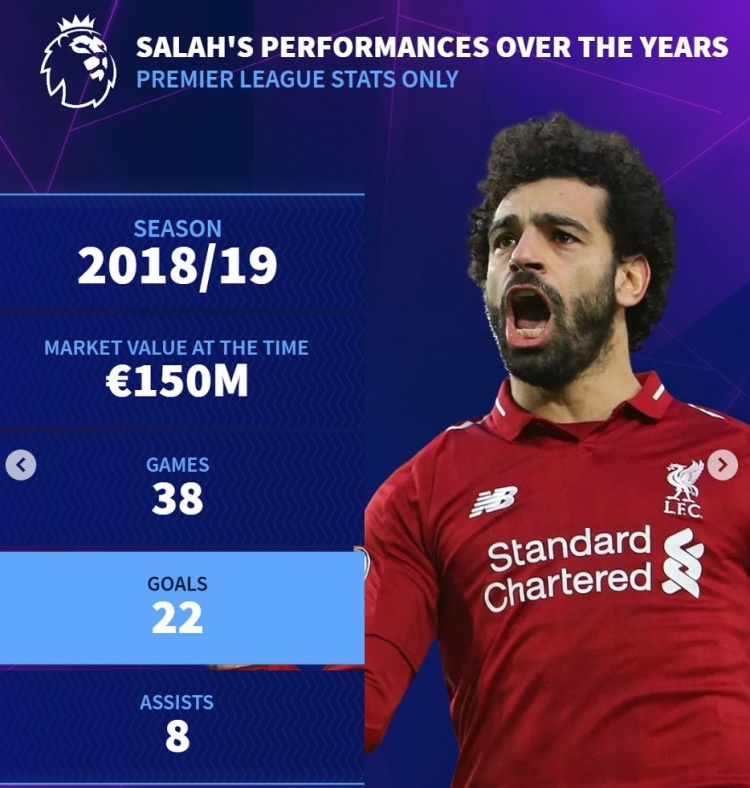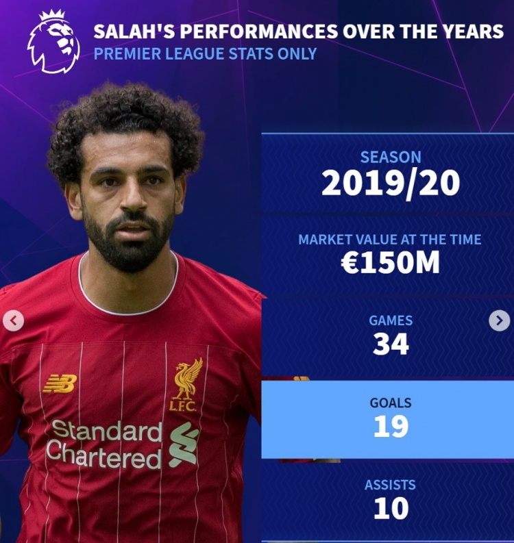 曇花不?。〉罗D(zhuǎn)列薩拉赫歷年英超數(shù)據(jù):身價最高1.5億歐元