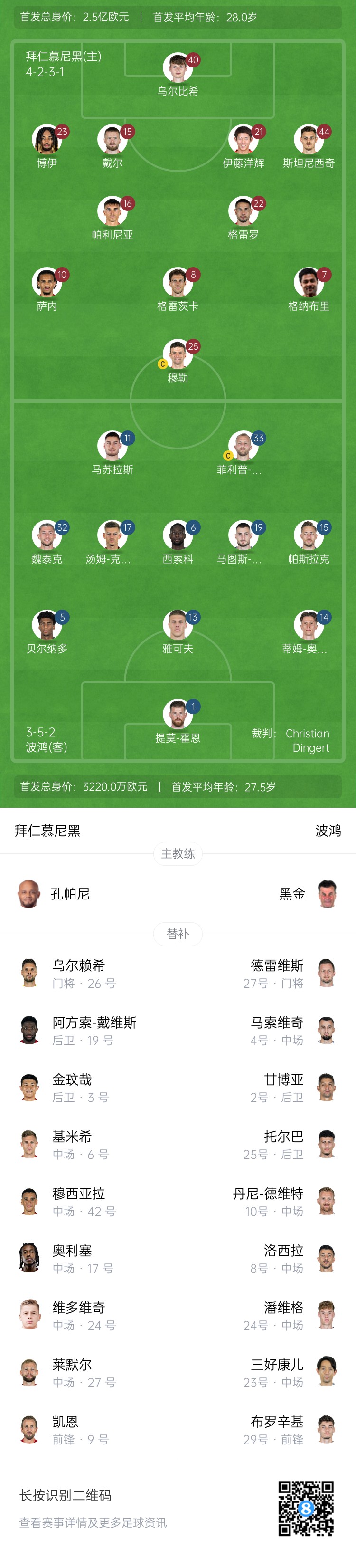拜仁替補(bǔ):26-烏爾賴希、3-金玟哉、6-基米希、9-凱恩、17-奧利塞、19-戴維斯、24-維多維奇、27-萊默爾、42-穆西亞拉