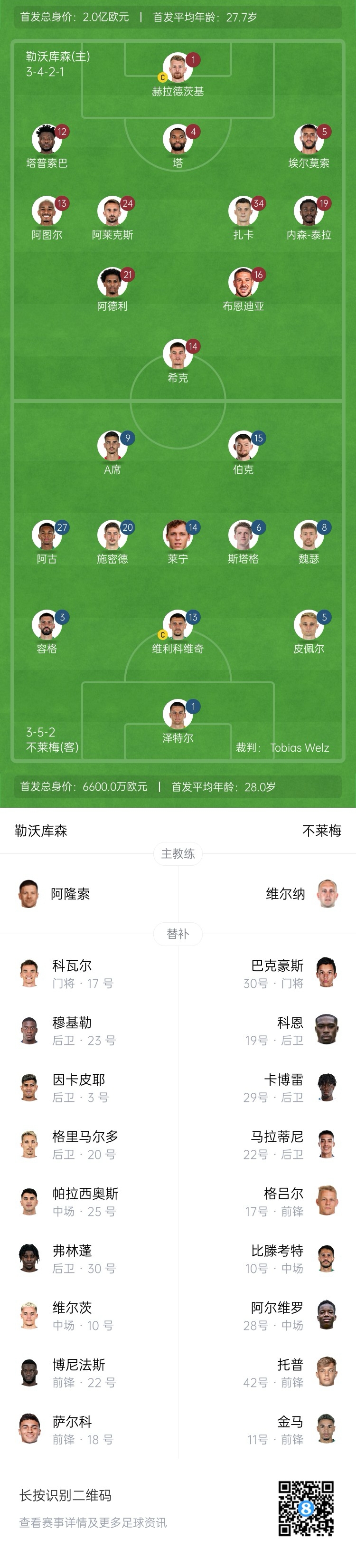 勒沃庫(kù)森首發(fā):1-赫拉德茨基、4-若納坦-塔、5-埃爾莫索、12-塔普索巴、13-阿圖爾、24-阿萊克斯-加西亞、16-布恩迪亞、34-扎卡、14-???、19-內(nèi)森-泰拉、21-阿德利