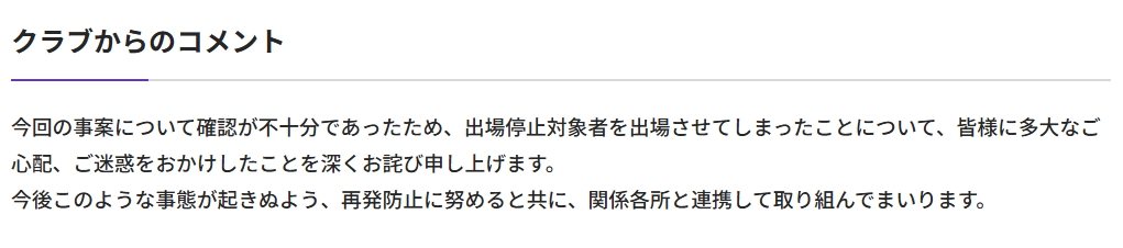 廣島三箭俱樂部官方寫道:“由于我們對此事件調(diào)查不充分,導(dǎo)致被禁賽的球員仍然參賽,給大家?guī)砹藫?dān)憂與不便,我們深表歉意。