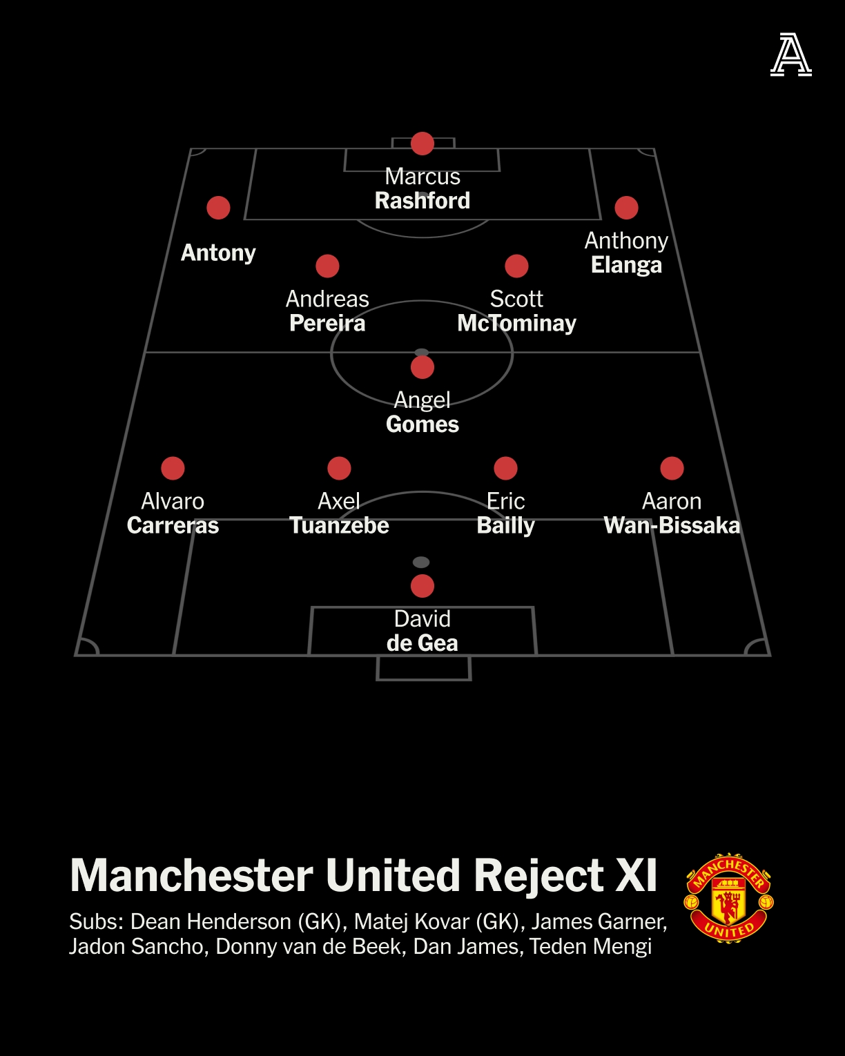 曼聯(lián)棄將隊(duì)首發(fā):德赫亞;阿爾瓦羅-費(fèi)爾南德斯、圖安澤貝、拜利、萬-比薩卡;安赫爾-戈麥斯、佩雷拉、麥克托米奈;安東尼、拉什福德、伊蘭加