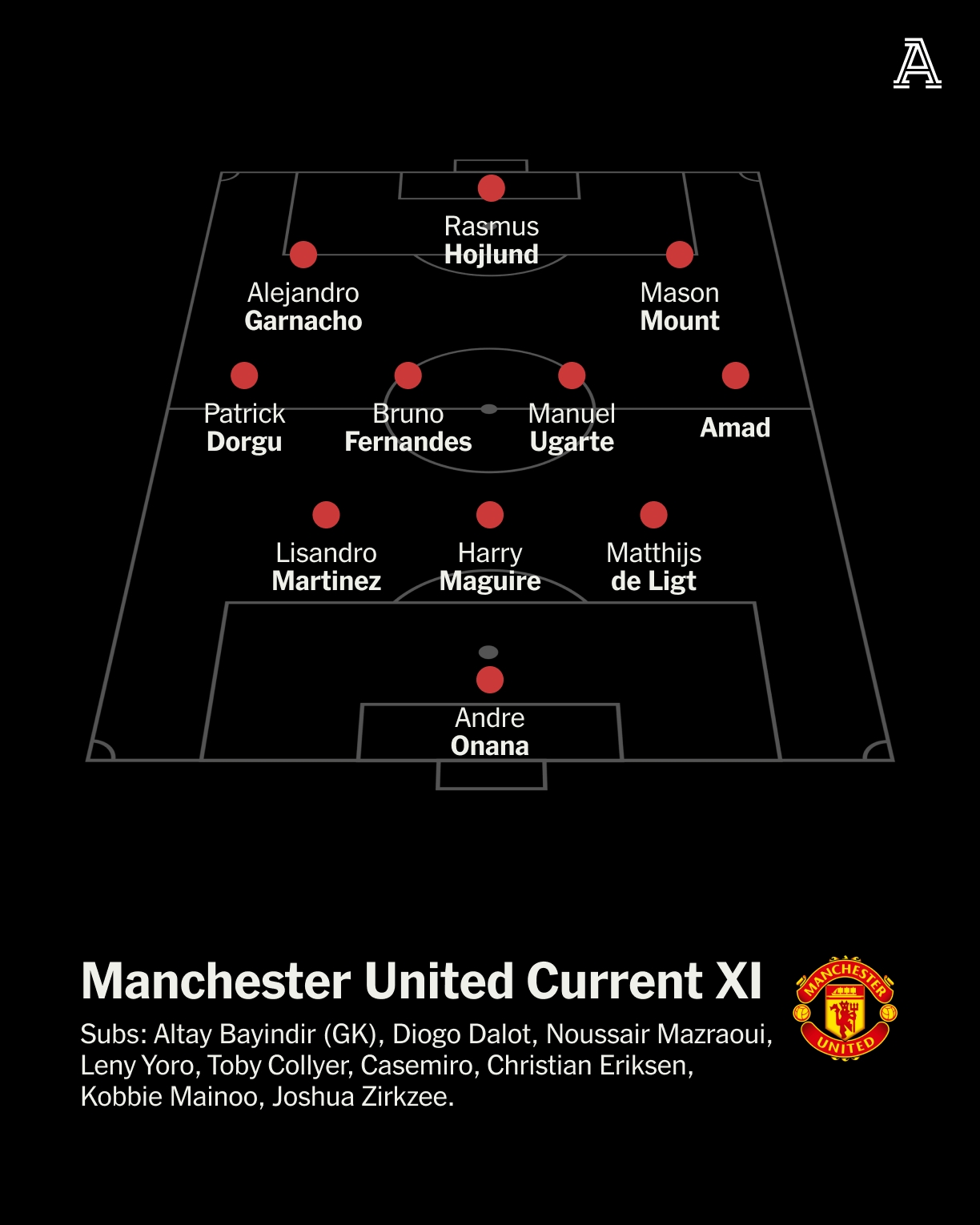 曼聯(lián)現(xiàn)役首發(fā):奧納納;利馬、馬奎爾、德里赫特;多古、B費(fèi)、烏加特、阿瑪?shù)?;加納喬、霍伊倫、芒特