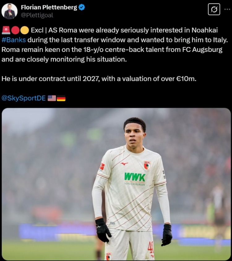 報道稱羅馬在上一個轉(zhuǎn)會窗就已經(jīng)認(rèn)真考慮引進(jìn)班克斯,球隊現(xiàn)在還一直關(guān)注著球員的情況。班克斯目前與奧格斯堡的合同將在2027年到期,預(yù)計的轉(zhuǎn)會身價超過1000萬歐。