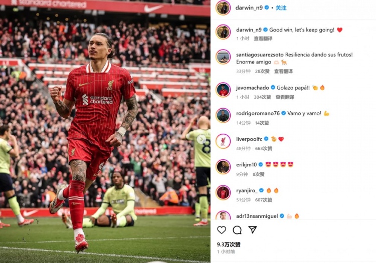 努涅斯也在賽后通過社媒曬出自己進(jìn)球后的慶祝照,并配文:“很棒的勝利!讓我們繼續(xù)努力!”