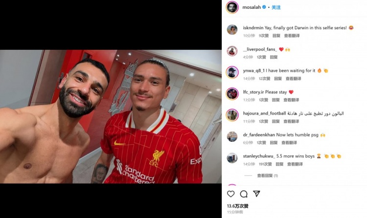 薩拉赫在本賽季比賽后通常都會曬出自己和進球隊友的合照,球迷們也調侃道:“終于輪到努涅斯了?!?/p>