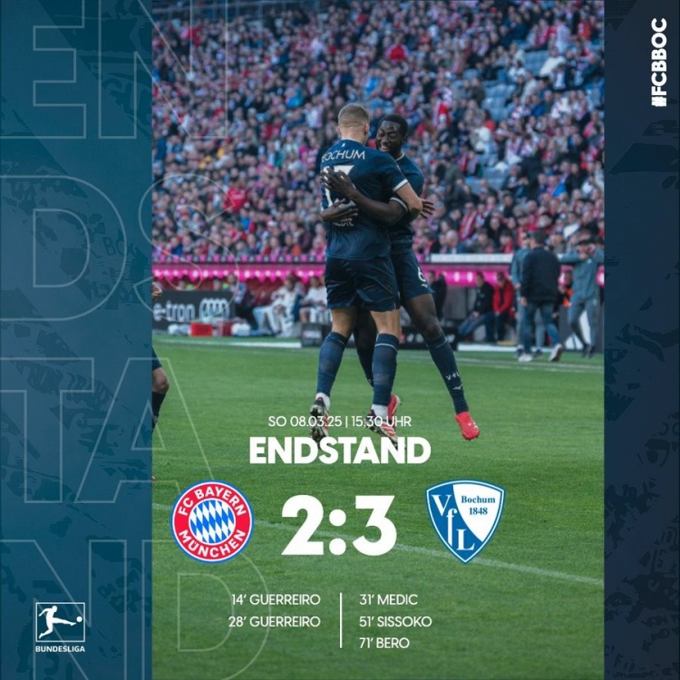 在德甲落后拜仁2球但最終逆轉(zhuǎn)獲勝!波鴻是歷史第4隊(duì)