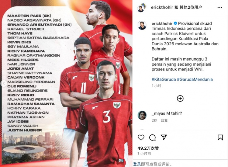 3月9日訊 今日,印尼足協(xié)主席托希爾更新社媒,曬出了印尼國家隊(duì)3月份18強(qiáng)賽大名單,迪克斯、伊澤斯、哈耶、帕斯、小賴因德斯、費(fèi)爾東克等歸化球員悉數(shù)入選,不過在本月完成歸化的埃米爾-奧德羅、迪恩-魯本-詹姆斯、喬伊-佩盧佩西因手續(xù)未完成,暫未入選。