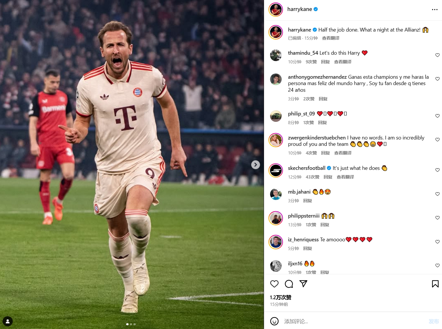 本場(chǎng)比賽凱恩梅開(kāi)二度,賽后他也在個(gè)人社媒曬出本場(chǎng)慶祝照片,配文寫(xiě)道:“完成一半的工作,安聯(lián)球場(chǎng)的美妙之夜!”