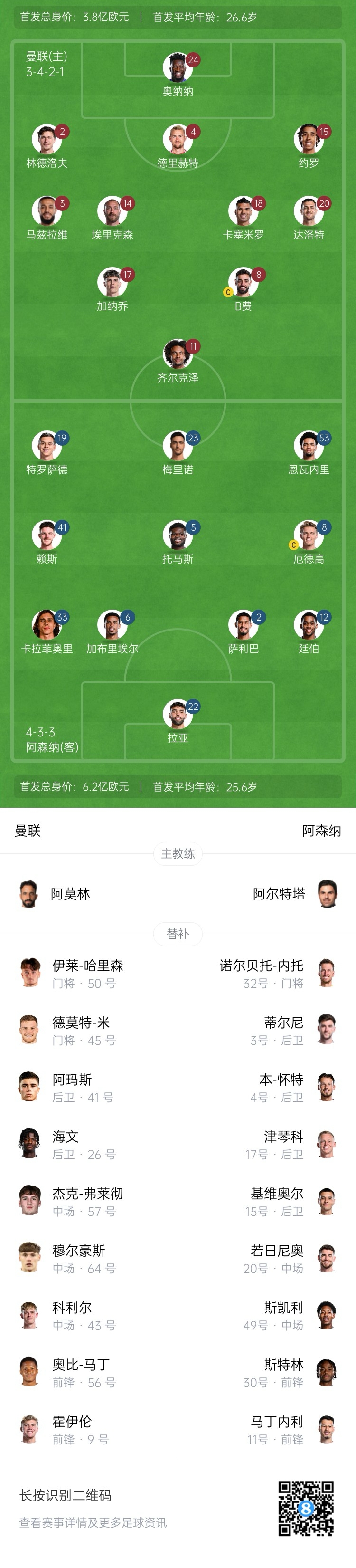 曼聯(lián)替補:45-德莫特-米、50-哈里森、41-阿瑪斯、26-海文、43-科利爾、57-弗萊徹、64-穆爾豪斯、56-奧比、9-霍伊倫