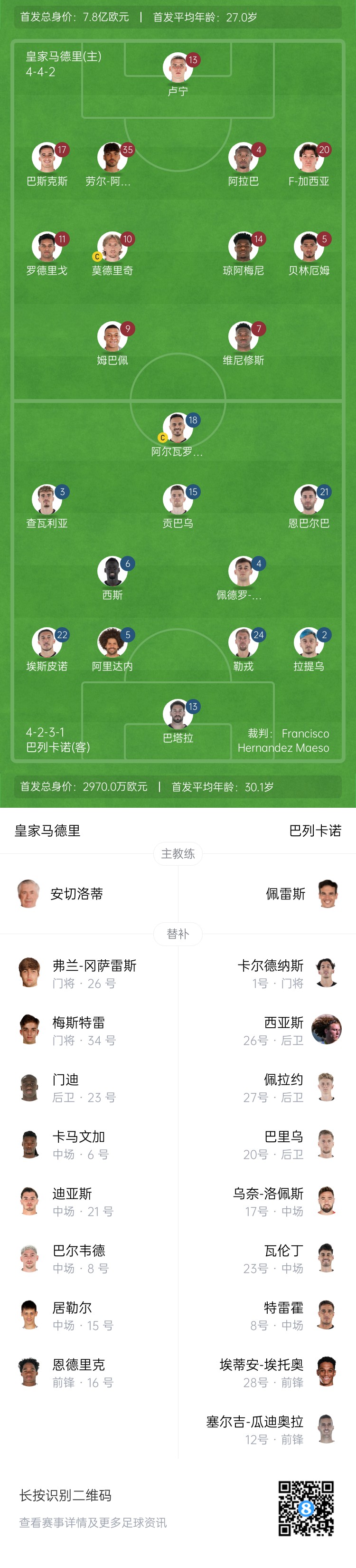 皇馬首發(fā):13-盧寧、17-巴斯克斯、35-勞爾-阿森西奧、4-阿拉巴、20-弗蘭-加西亞、14-瓊阿梅尼、10-莫德里奇、5-貝林厄姆、11-羅德里戈、9-姆巴佩、7-維尼修斯