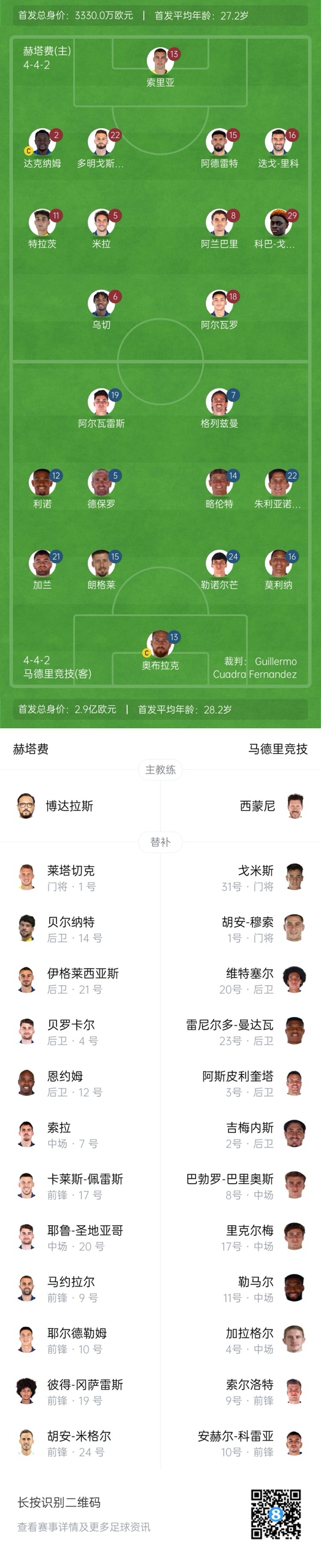 赫塔費首發(fā):13-索里亞2-杰內、5-米拉、6-烏切、8-阿蘭巴里、11-特拉茨、15-阿爾德雷特、16-里科、18-阿爾瓦羅-羅德里格斯、22-多明戈斯-杜阿爾特、29-科巴-達科斯塔