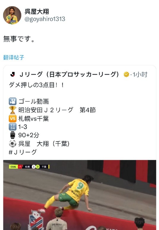 好在經(jīng)過(guò)一番檢查,吳屋大翔并無(wú)大礙,并回到球場(chǎng)繼續(xù)比賽,比賽結(jié)束后,吳屋大翔也轉(zhuǎn)發(fā)了自己“出糗”視頻,并寫道“平安無(wú)事?!保俅巫屒蛎詡儼残?。
