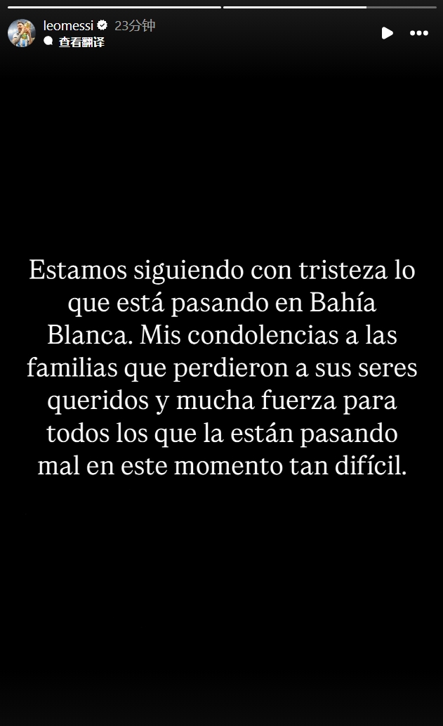 梅西寫道:“我們懷著悲痛的心情關(guān)注著bahía blanca正在發(fā)生的事情,我向那些失去親人的家庭致以哀悼,也希望所有在這個(gè)艱難時(shí)刻正經(jīng)歷困境的人能擁有力量。