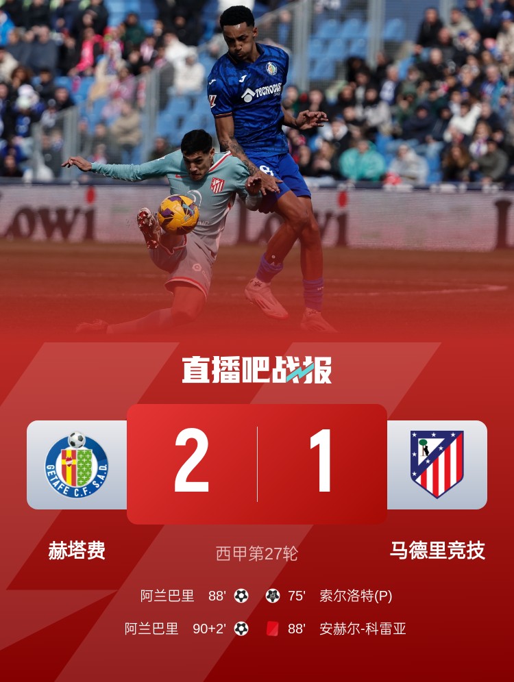 馬競1-2不敵赫塔費(fèi),科雷亞第88分鐘染紅,馬競錯失登頂機(jī)會!