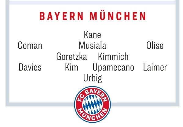 烏爾比希/戴維斯、金玟哉、于帕梅卡諾、萊默爾/格雷茨卡、基米希/科曼、穆西亞拉、奧利塞/凱恩