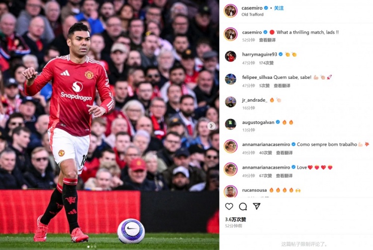 卡塞米羅也在賽后通過社媒曬出自己的比賽照,并感嘆:“小伙子們,多么激動人心的一場比賽!”馬奎爾也現(xiàn)身評論區(qū)并留下代表鼓勵的鼓掌表情????????。