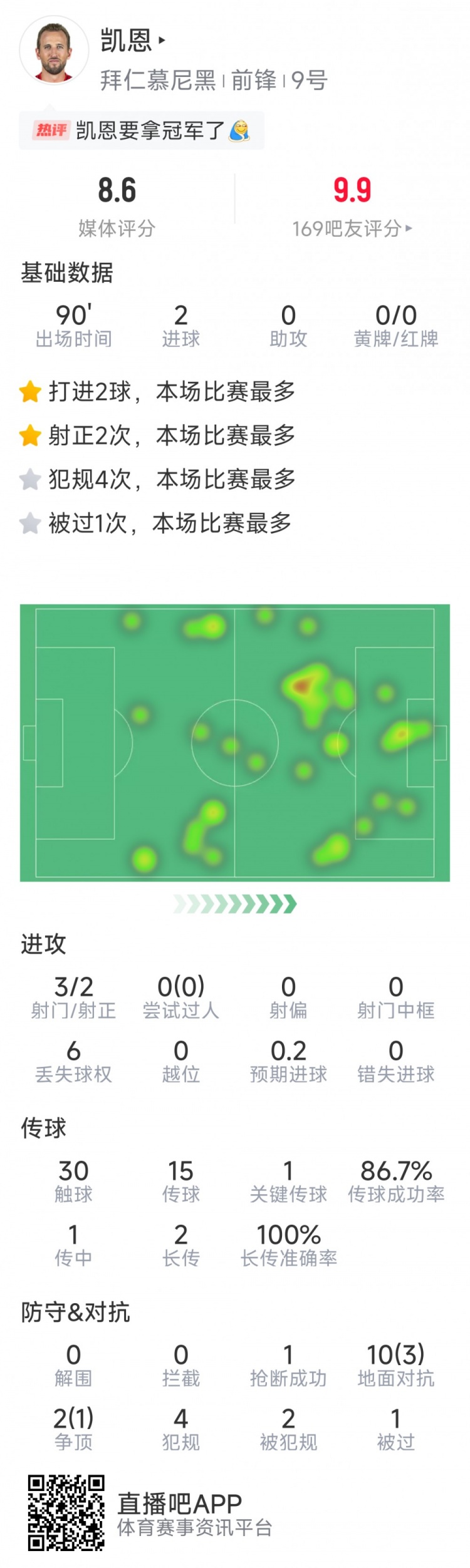 凱恩本場數(shù)據(jù):梅開二度,3射2正,1次關(guān)鍵傳球,評(píng)分8.6分