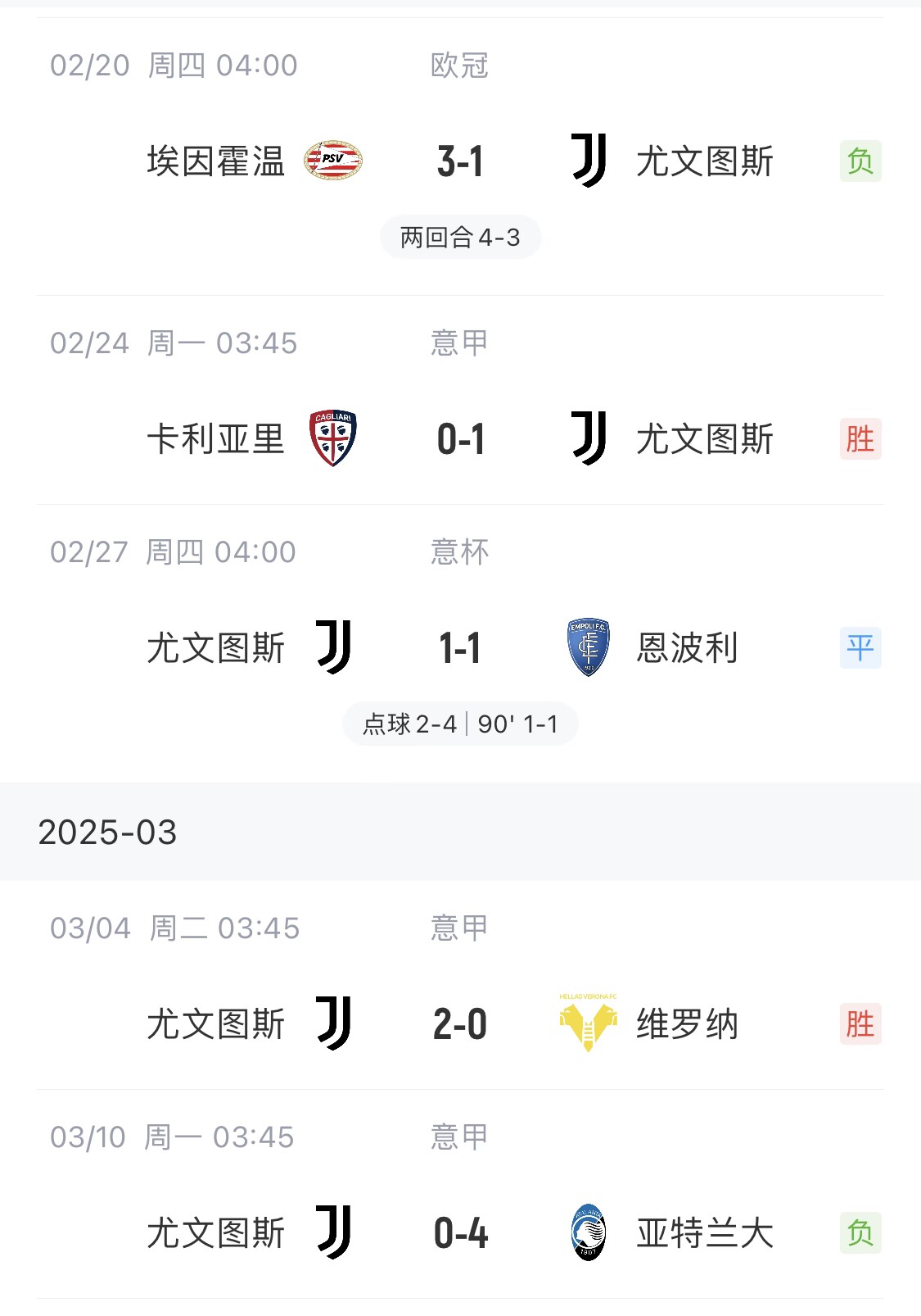 然而近一個月,尤文相繼遭遇歐冠附加賽失利,意杯出局:歐冠附加賽兩回合3-4不敵埃因霍溫,無緣淘汰賽;意大利杯則是點球出局,不敵降級區(qū)的恩波利。