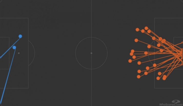 在whoscored統(tǒng)計的射門圖上,利物浦唯一的射正就進球了,另一腳頂向了角旗;巴黎的射門則是密密麻麻……