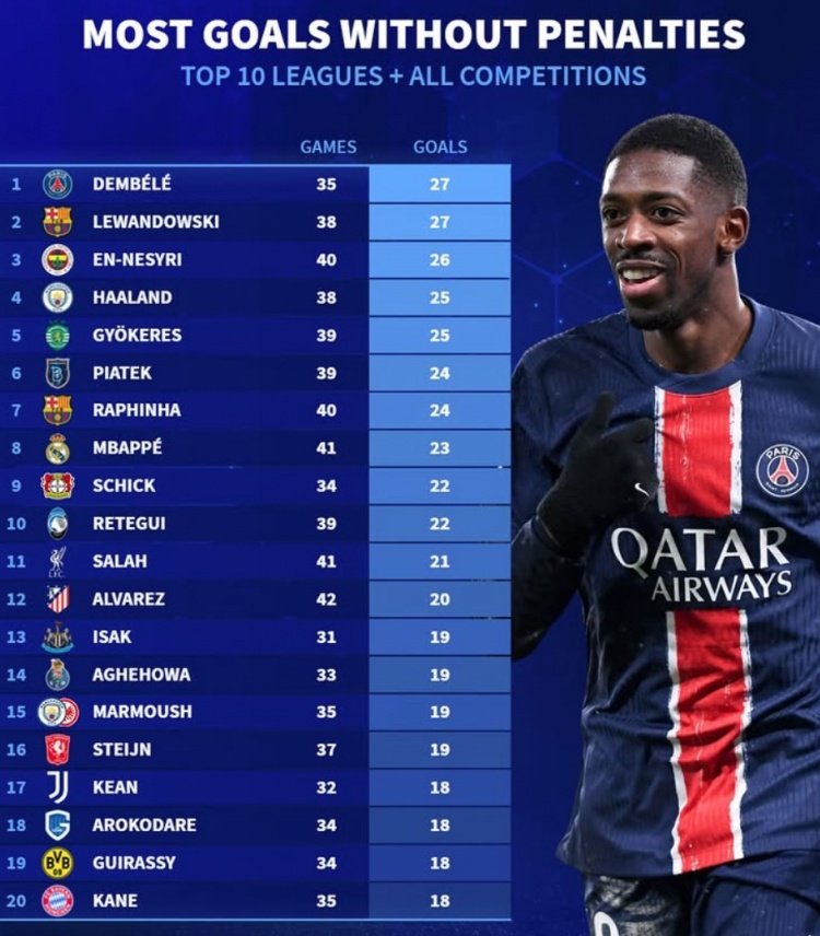本賽季各項(xiàng)賽事無(wú)點(diǎn)球射手榜:登貝萊&萊萬(wàn)27球,哈蘭德25球