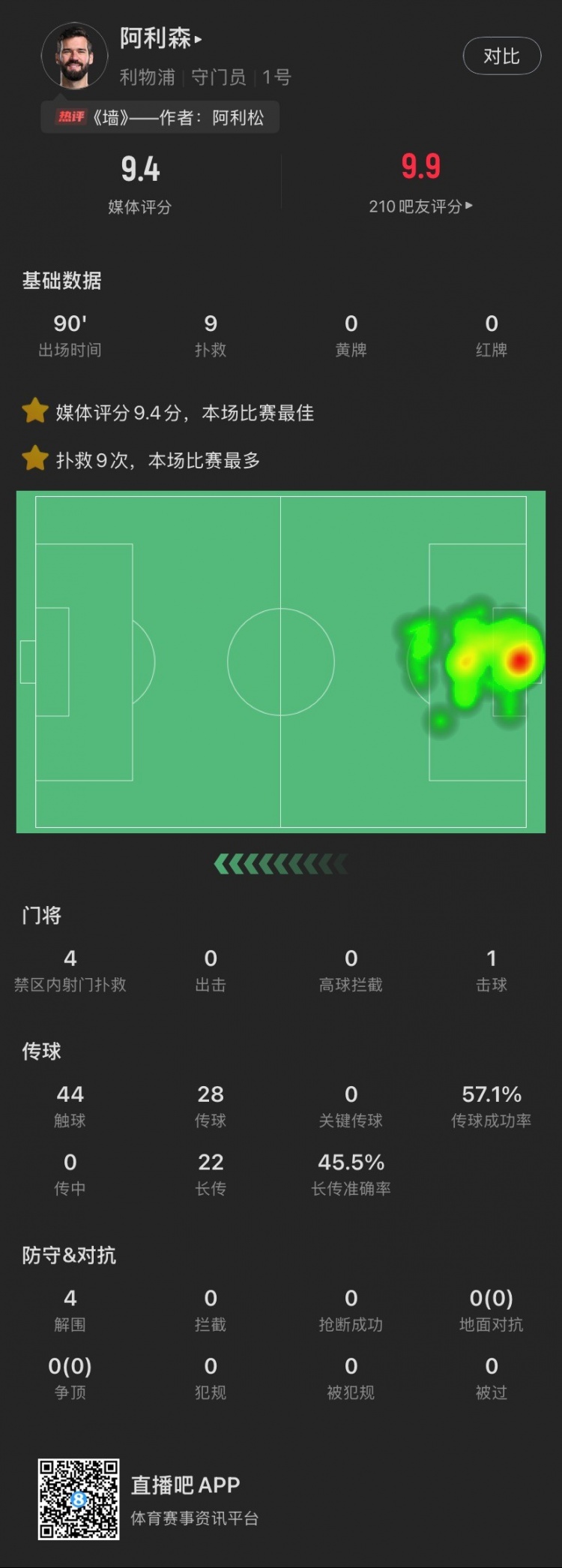 頭號(hào)功臣!阿利森本場(chǎng):9次撲救,被射27腳0丟球,9.4分全場(chǎng)最高