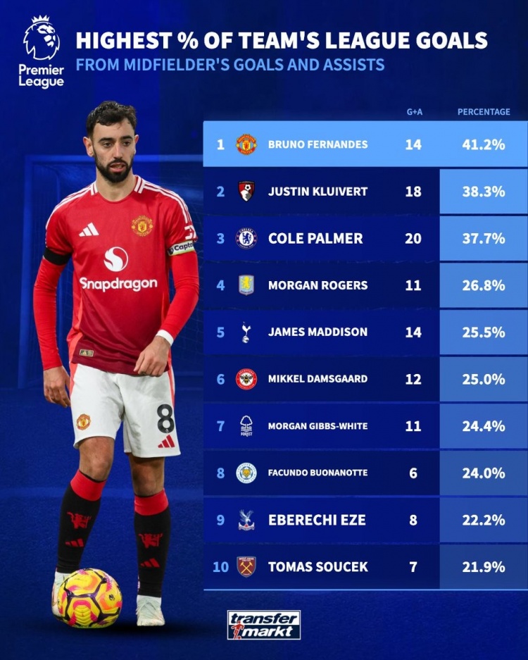 3月10日訊 《轉(zhuǎn)會(huì)市場(chǎng)》統(tǒng)計(jì)了本賽季英超中場(chǎng)球員參與全隊(duì)聯(lián)賽總進(jìn)球的比率,B費(fèi)獨(dú)占榜首。