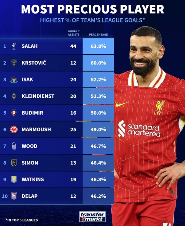 3月11日訊 《轉(zhuǎn)會市場》統(tǒng)計了本賽季五大聯(lián)賽直接參與進(jìn)球占全隊總進(jìn)球的比率情況,薩拉赫無懸念居首,已經(jīng)轉(zhuǎn)會曼城的馬爾穆什依然是法蘭克福隊內(nèi)最高。