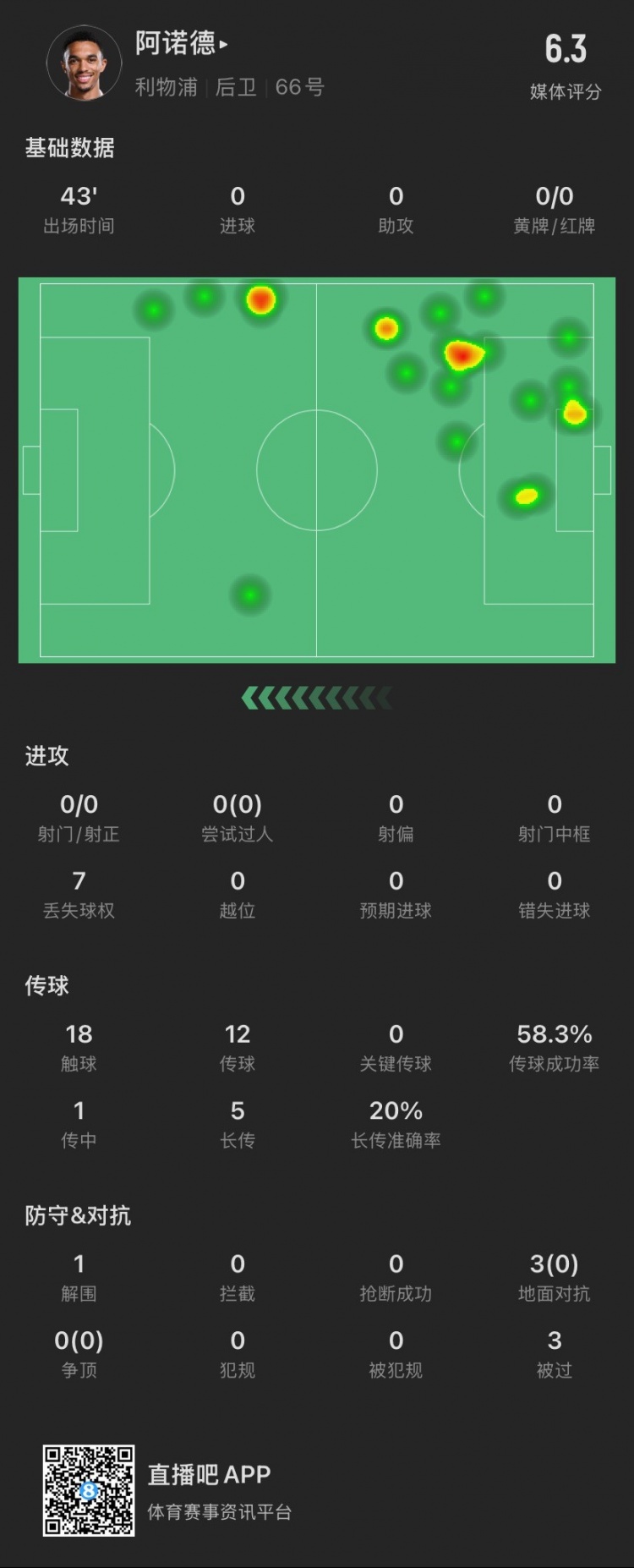 阿諾德半場數(shù)據(jù):被過3次,3次對抗0成功,貢獻1解圍