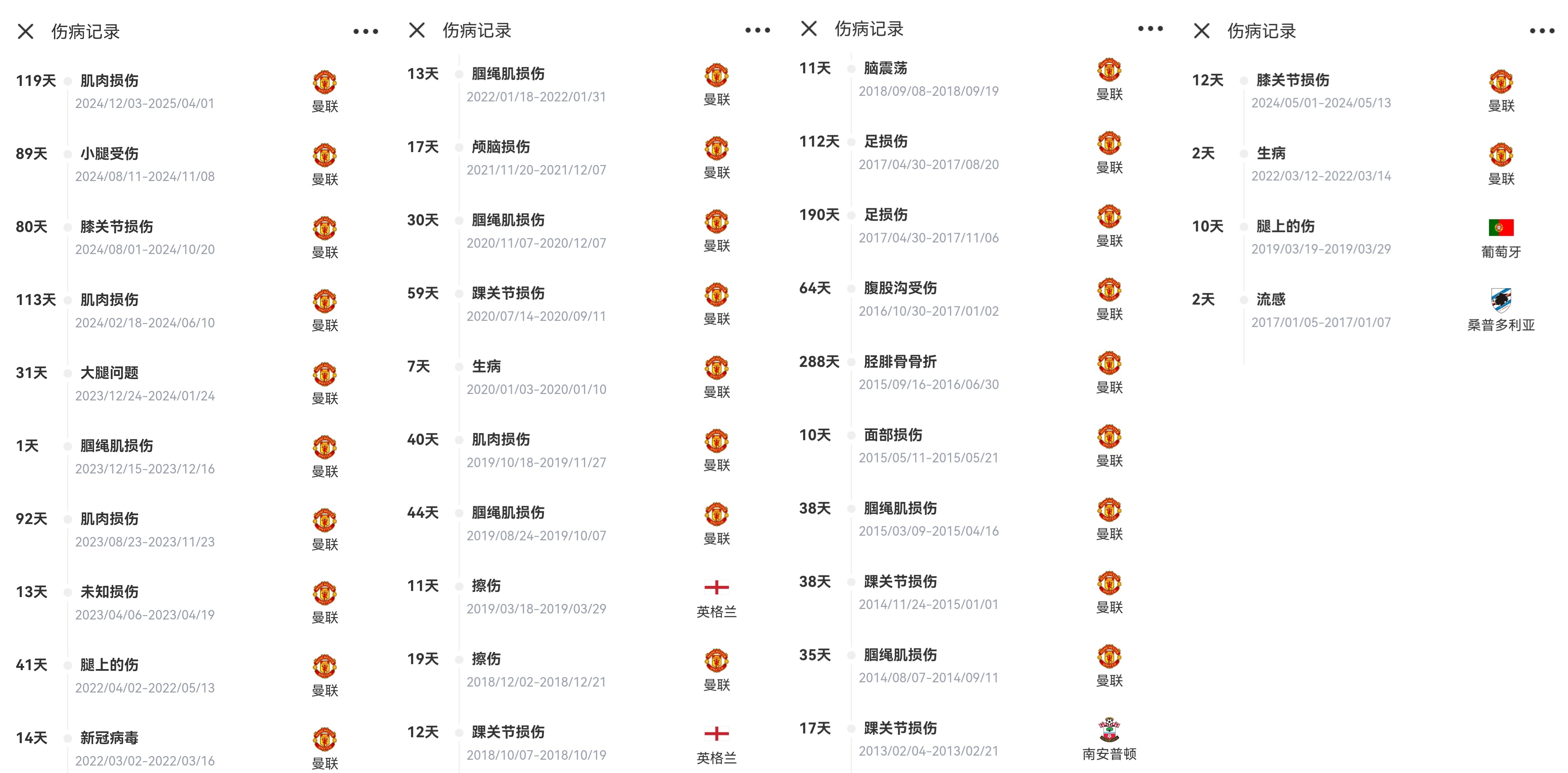 以下為盧克肖和B費(fèi)生涯因傷缺陣的情況,左邊三頁(yè)是盧克肖的,右邊一頁(yè)是B費(fèi)的。