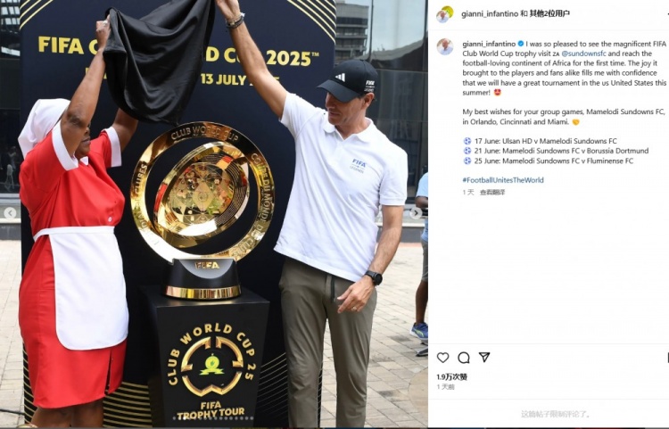 因凡蒂諾:很高興看到世俱杯獎(jiǎng)杯首次抵達(dá)熱愛足球的非洲大陸