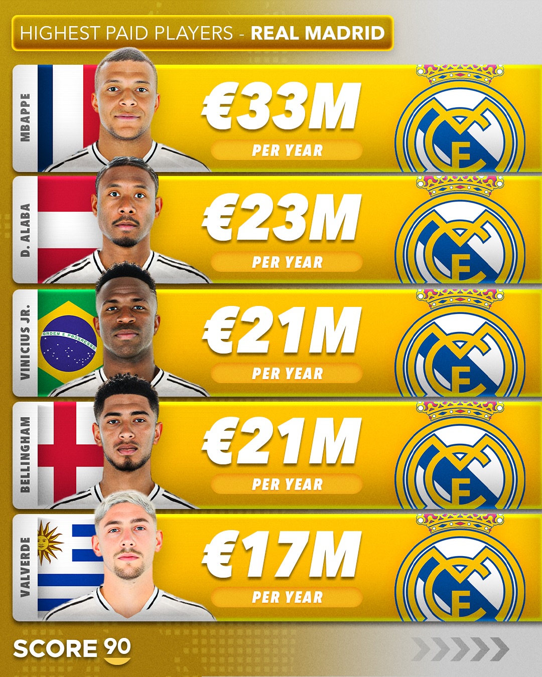 皇馬年薪前5:姆總3300萬第1 阿拉巴2300萬 維尼修斯&貝林2100萬