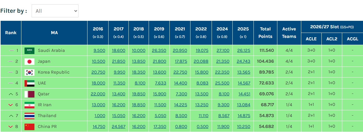 但如果申花被淘汰,則本賽季結(jié)束后中國的亞足聯(lián)俱樂部技術(shù)分一定會落后于泰國,這意味著中超球隊參加26/27賽季的亞足聯(lián)賽事名額從2+1+1降為1+1+1(一支直通亞冠精英正賽+1個亞冠精英附加賽+1支直通亞冠二級聯(lián)賽正賽)。