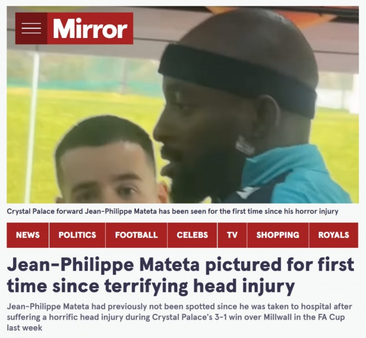在對陣米爾沃爾的足總杯中,前場高空球拼搶,米爾沃爾門將羅伯茨出擊用腳解圍,隨后踢中了馬特塔。據(jù)此前水晶宮官方公告,馬特塔左耳附近嚴重撕裂,縫了25針。