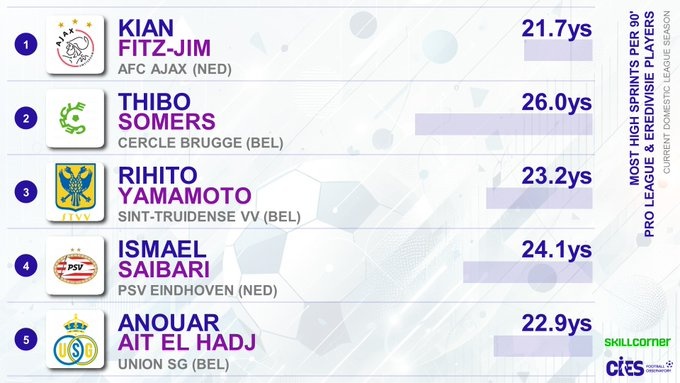 3月11日訊 數(shù)據(jù)分析機(jī)構(gòu)SkillCorner統(tǒng)計(jì)比甲和荷甲高速沖刺能力排行榜,阿賈克斯華裔中場天樂上榜。