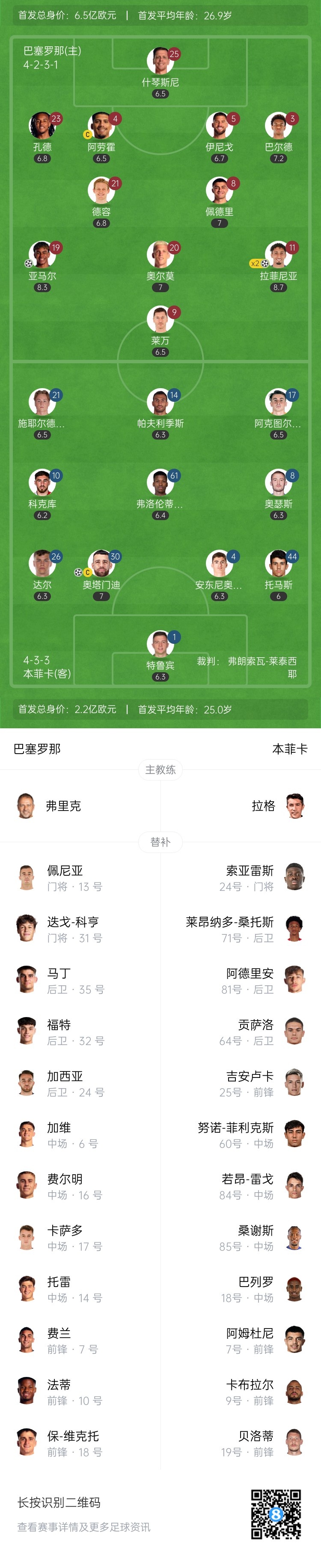 半場(chǎng)-巴薩3-1本菲卡總比分4-1領(lǐng)先 亞馬爾傳射拉菲尼亞雙響