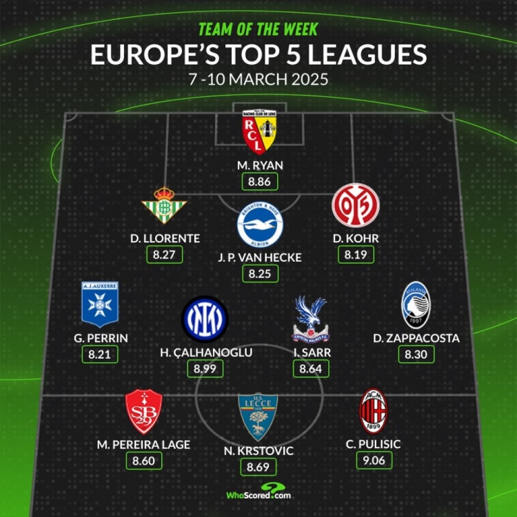 whoscored本周五大聯(lián)賽最佳陣:普利西奇&恰20領銜,袋鼠國門在列