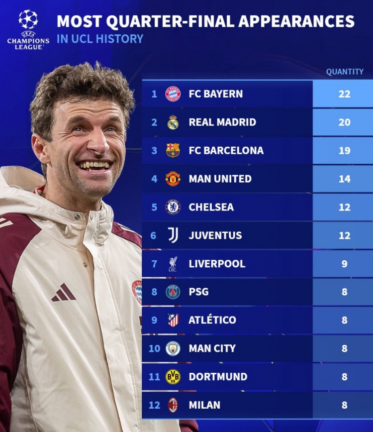 改制后歐冠共12支球隊至少8次晉級八強:仁皇薩前3,魔車文進前6