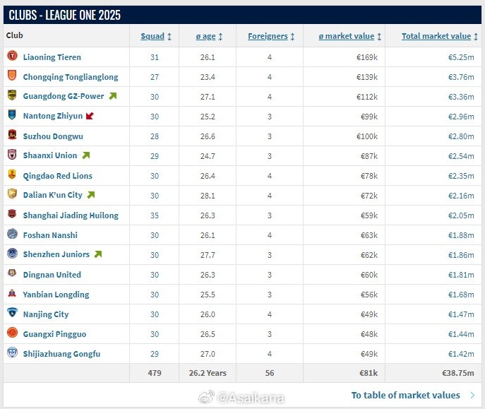 中甲聯(lián)賽各隊(duì)名單已在轉(zhuǎn)會(huì)市場更新。一線隊(duì)總身價(jià)最高的是遼寧鐵人,為525萬歐元,后面依次是重慶銅梁龍(376萬歐元)、廣東廣州豹(336萬歐元)、南通支云(296萬歐元)、蘇州東吳(280萬歐元)、陜西聯(lián)合(254萬歐元)、青島紅獅(235萬歐元)、大連鯤城(216萬歐元)、上海嘉定匯龍(205萬歐元)、佛山南獅(188萬歐元)、深圳青年人(186萬歐元)、定南贛聯(lián)(181萬歐元)、延邊龍鼎(168萬歐元)、南京城市(147萬歐元)、廣西平果(144萬歐元)、石家莊功夫(142萬歐元)。重慶銅梁龍是平均年齡最小的球隊(duì),為23.4歲;大連鯤城平均年齡最大,為28.1歲。