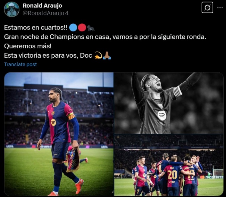 巴薩隊(duì)長(zhǎng)阿勞霍也在賽后社媒曬照,將勝利獻(xiàn)給球隊(duì)已故隊(duì)醫(yī),配文寫道:“我們晉級(jí)8強(qiáng),很棒的歐冠主場(chǎng)之夜,讓我們晉級(jí)下一輪!我們還想要更多。勝利獻(xiàn)給你,醫(yī)生?!?/p>
