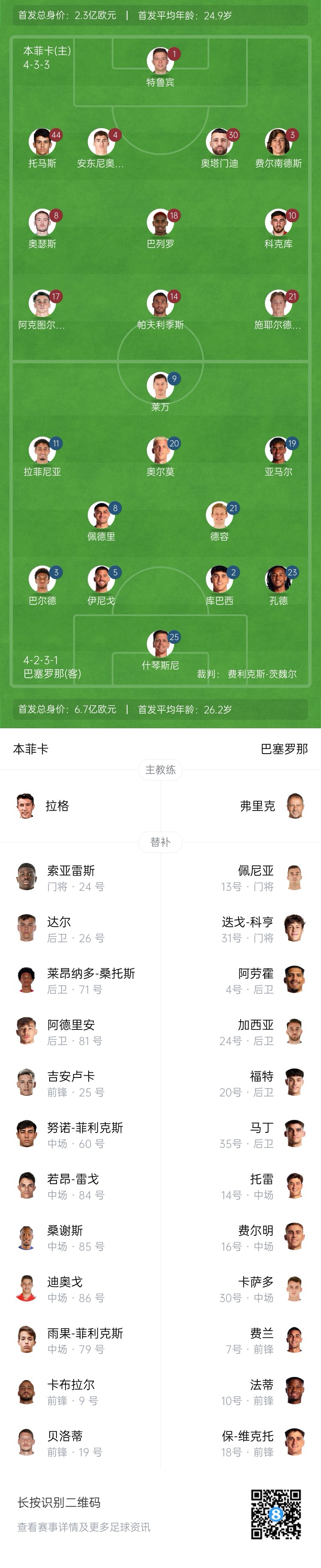 巴薩首發(fā):25-什琴斯尼、2-庫巴西、3-巴爾德、5-伊尼戈-馬丁內(nèi)斯、23-孔德、8-佩德里、21-德容、20-奧爾莫、19-亞馬爾、11-拉菲尼亞、9-萊萬