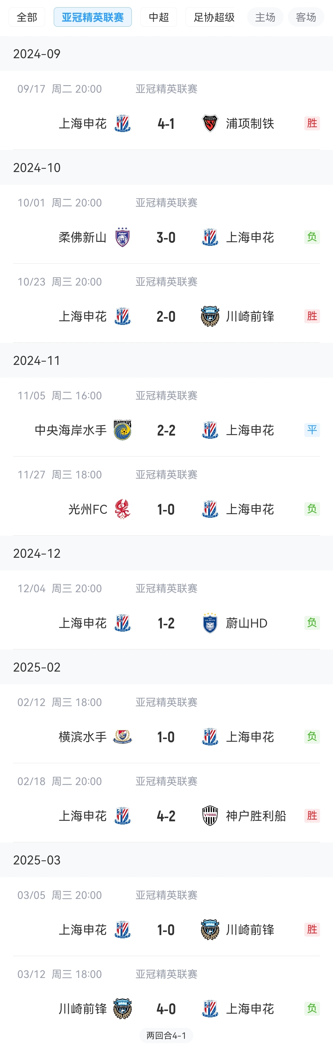 主場龍!申花本賽季亞冠戰(zhàn)績:主場4勝&雙殺川崎 客場4負(fù)&4球潰敗