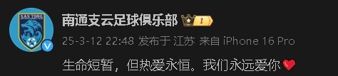 南通支云俱樂部社媒發(fā)文悼念:生命短暫,但熱愛永恒。我們永遠愛你??