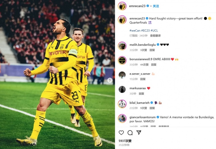埃姆雷-詹也在賽后通過(guò)社媒曬出了自己的怒吼慶祝照,并配文:“全隊(duì)努力鏖戰(zhàn)贏下勝利??????歐冠八強(qiáng)戰(zhàn)????