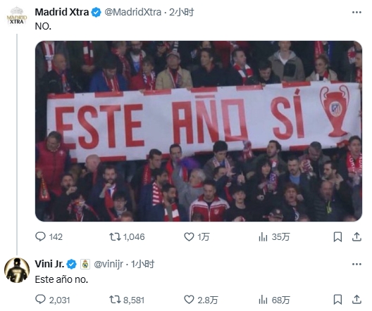 本場比賽馬競球迷在看臺舉起橫幅:歐冠就今年了!皇馬的球迷號曬出橫幅并表示NO,維尼修斯社媒回復(fù)該球迷號:今年,NO!