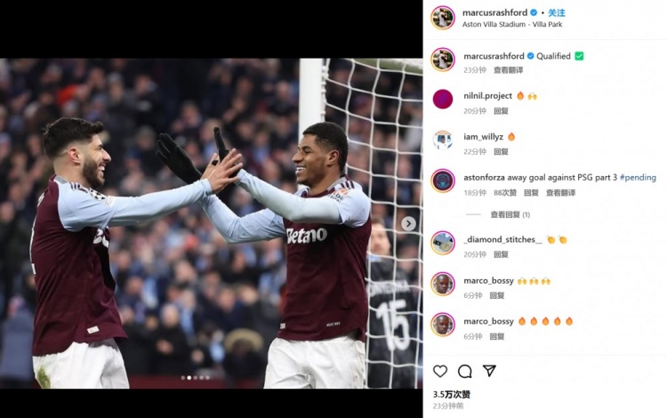 拉什福德也在賽后通過社媒曬出自己和另一位租借球員阿森西奧的慶祝照,并言簡意賅配文:“晉級!”